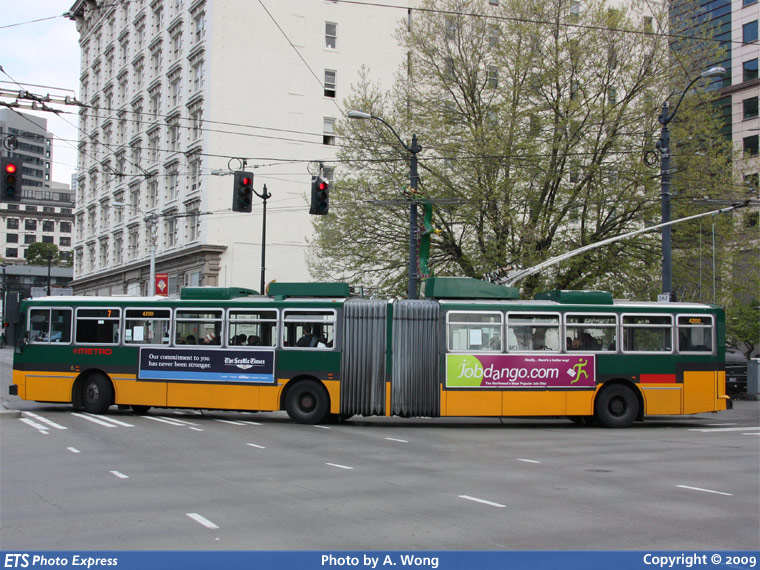KCM 4200 is seen turning from Jackson Street onto 4th Avenue northbound while working route 7.