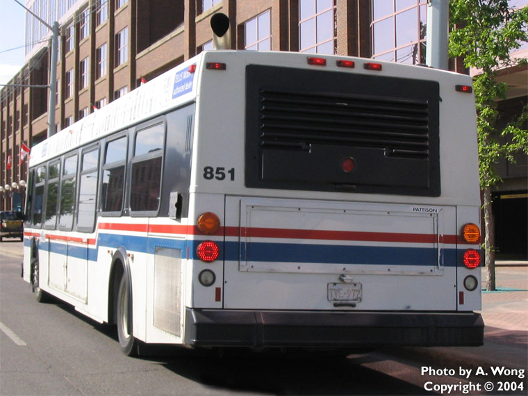St Albert 851 is seen picking up passengers southbound on 97 Street near Jasper Avenue.