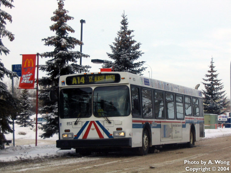 St Albert 853, a 1998 NewFlyer D40LF, is seen on River Crest Crescent in St. Albert while working a route A14 to St. Albert North.