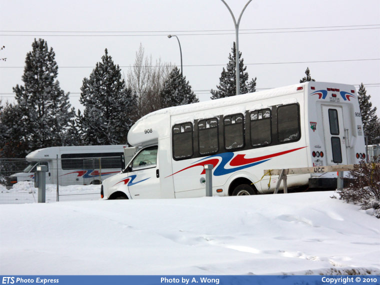 St Albert 906 and 908 are StarTrans Candidate shuttle buses used for handibus service. They are seen parked at the St Albert Transit garage.
