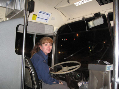 Vanessa at the wheel of a BBC trolley. (Photo by Terry D.)
