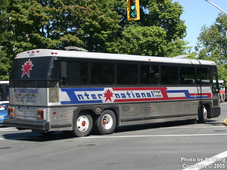 International Stage Lines 966 is seen turning onto Belleville Street in Victoria while working a charter.