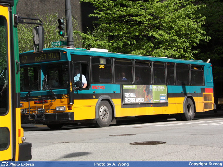 KCM 3242 is seen northbound on 3rd Avenue at Spring Street while working route 17 Sunset Hill.