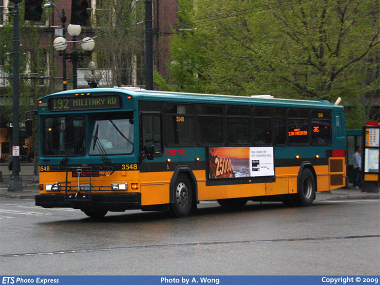 KCM 3548 is seen turning from 2nd Avenue onto Jackson Street eastbound while working route 192 Military Road.
