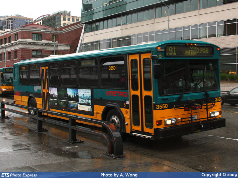 KCM 3550 is seen southbound on 4th Avenue near Weller Street while working route 191. Route 191 was discontinued in September 2009.