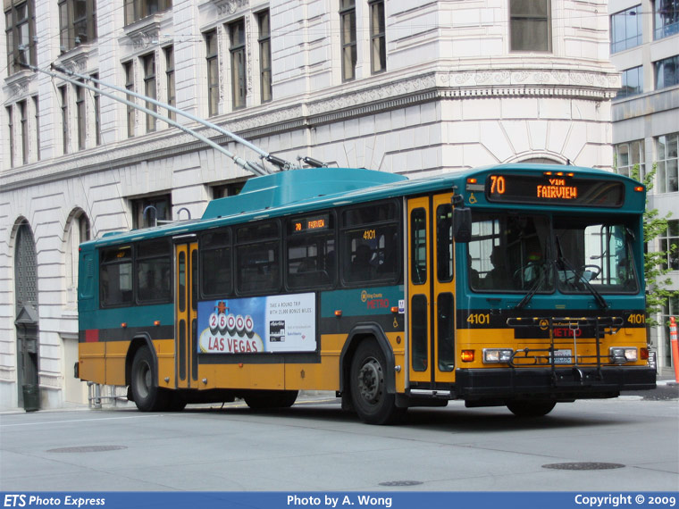 KCM 4101 is seen southbound on Stewart Street at 4th Avenue while working route 70.