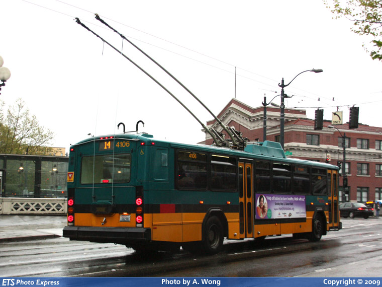 KCM 4106 is seen on 2nd Avenue at Jackson Street while working route 14.