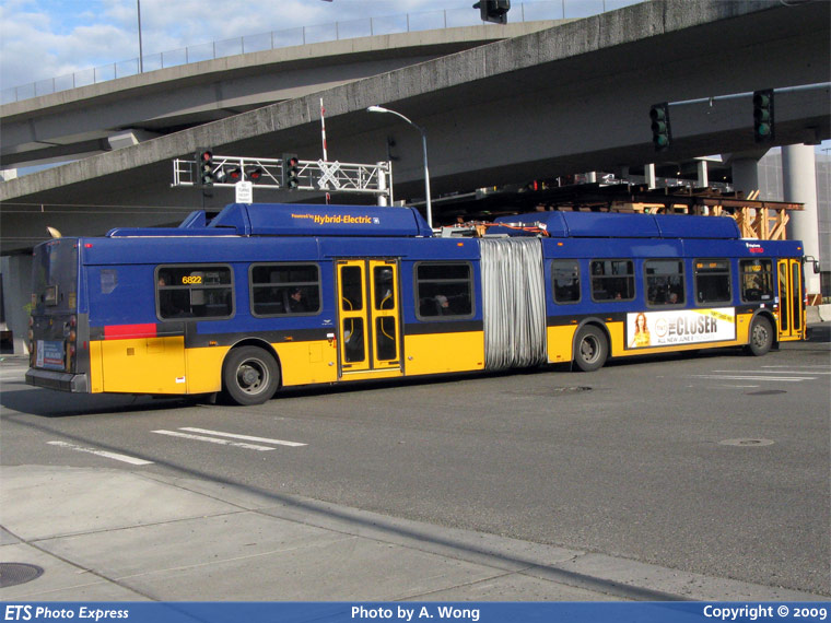 KCM 6822 is seen on 5th Avenue at Royal Brougham Way after exiting the Seattle Transit Tunnel.