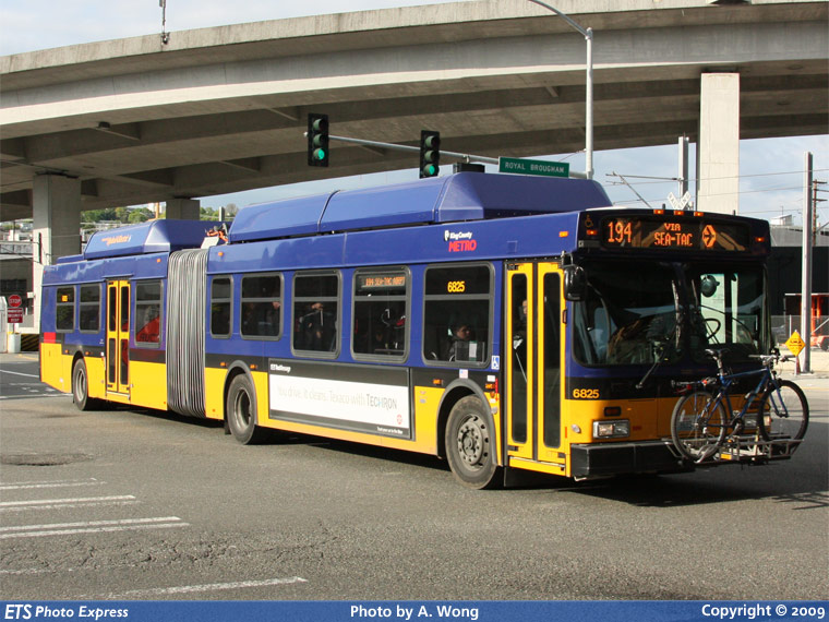 KCM 6825 is seen working route 194 while on 5th Avenue at Royal Brougham Way after exiting the Seattle Transit Tunnel.