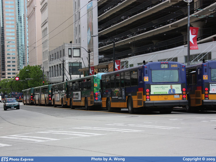 A lineup of KCM buses are seen downtown on 3rd Avenue backed up after a trolley line break.