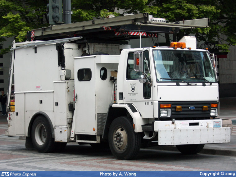 KCM EXT141, a trolley line truck, is seen parked in downtown Seattle.