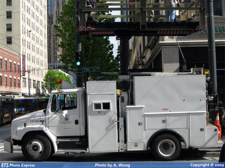 KCM EXT144 is seen responding to a wire break on 3rd Avenue at Pike Street.