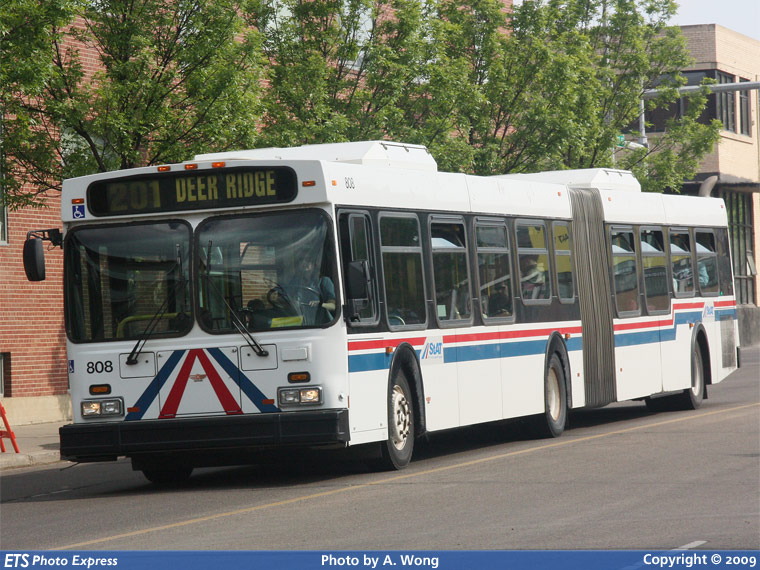 St Albert 808 is seen northbound on 107 Street at 104 Avenue while working route 201 Deer Ridge.