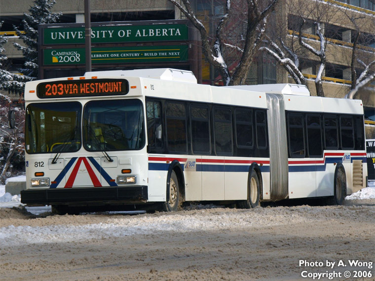 St Albert 812 is seen westbound on 87 Avenue near 115 Street while working route 203 St Albert via Westmount.